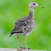 The Upland Sandpiper is a black, brown, and white mottled bird with a long neck and tail and yellow legs. It has a round head with large, black eyes, and a relatively short bill for a sandpiper. In flight, it shows a pale inner wing, dark outer wing, and white outer primary shaft.