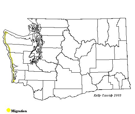 Wandering Tattlers are common migrants on the coast of Washington. They are rare in Puget Sound and other parts of Washington. In the spring, they are common from mid-April to mid-May. They are usually gone from the Washington coast by the second week of May. The post-breeding migration is more protracted, with adults common on Washington's rocky outer coast from mid-July into August. By the second week of August, most of the Wandering Tattlers coming through are juveniles, and are common into October.